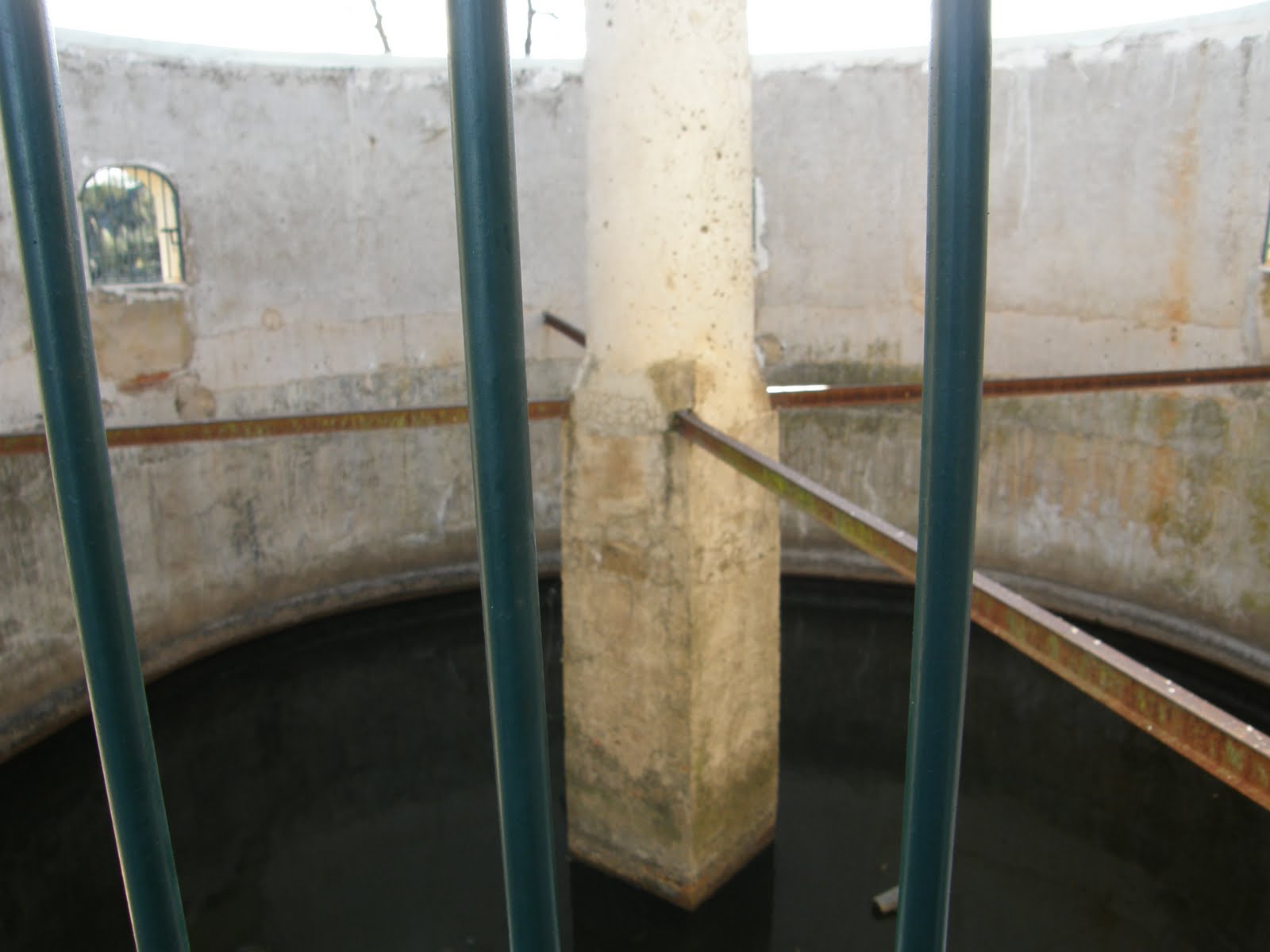 El pozo, de planta circular, construido con ladrillos, tiene cuatro brocales abiertos a media altura en arco de medio punto enmarcados en falsa cantería; el resto del muro está revocado con cal.