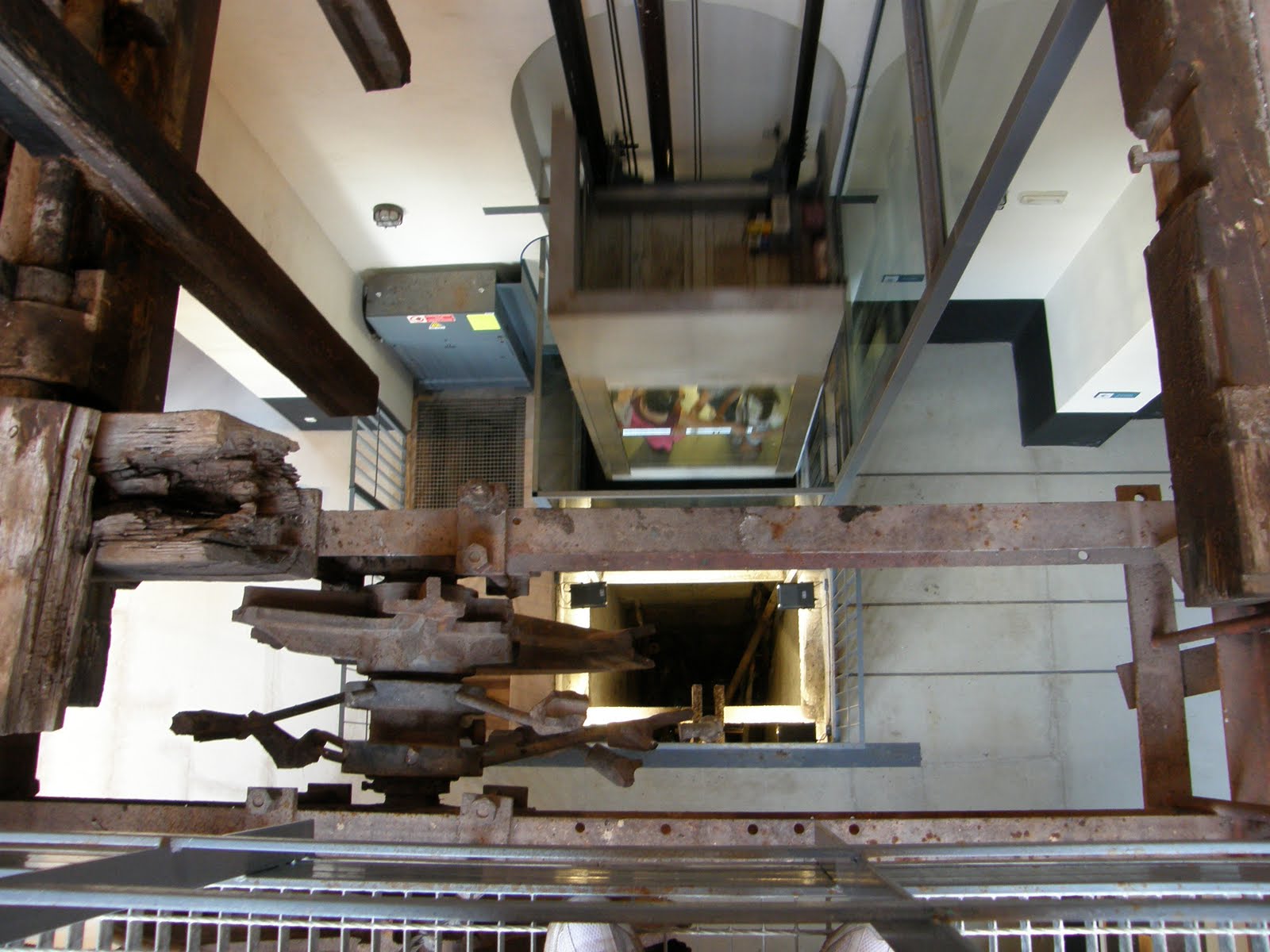 Encima del hueco las antiguas ruedas que sostenían los ascensores de bajada a la mina y su original estructura de madera.