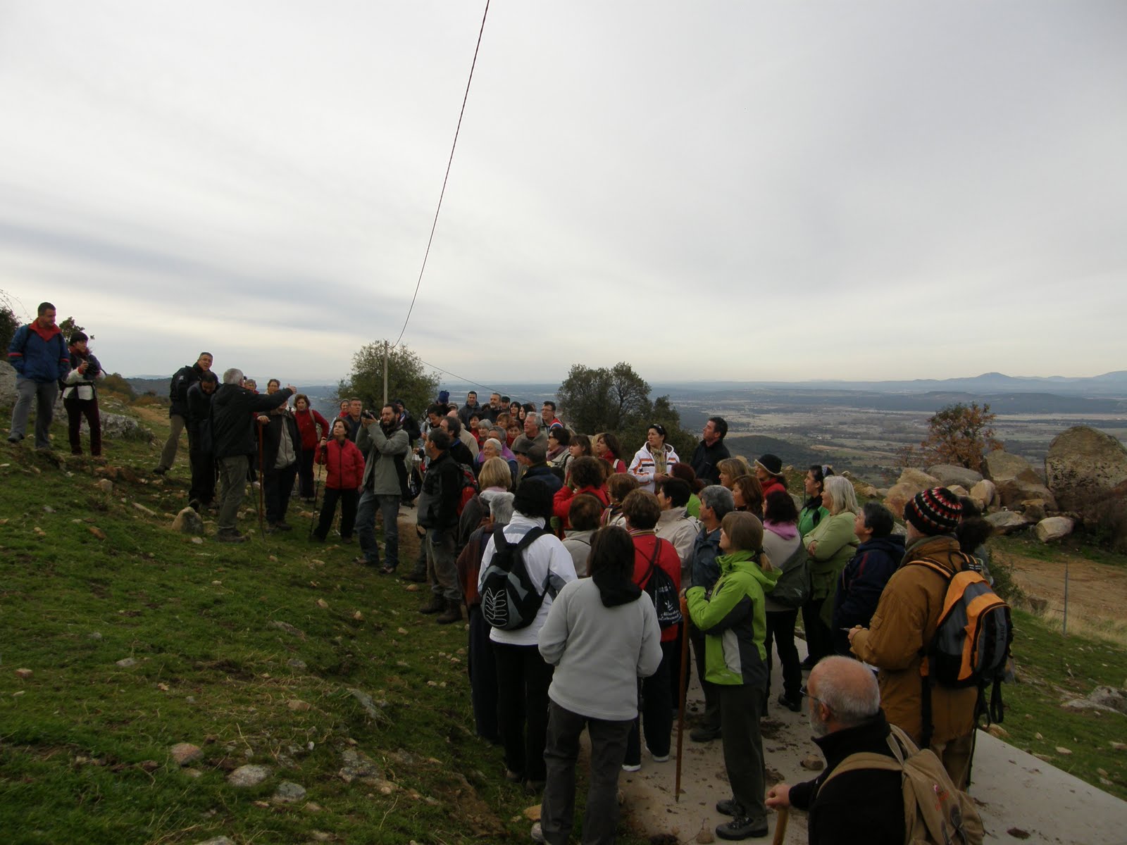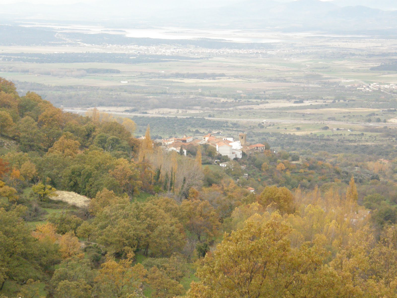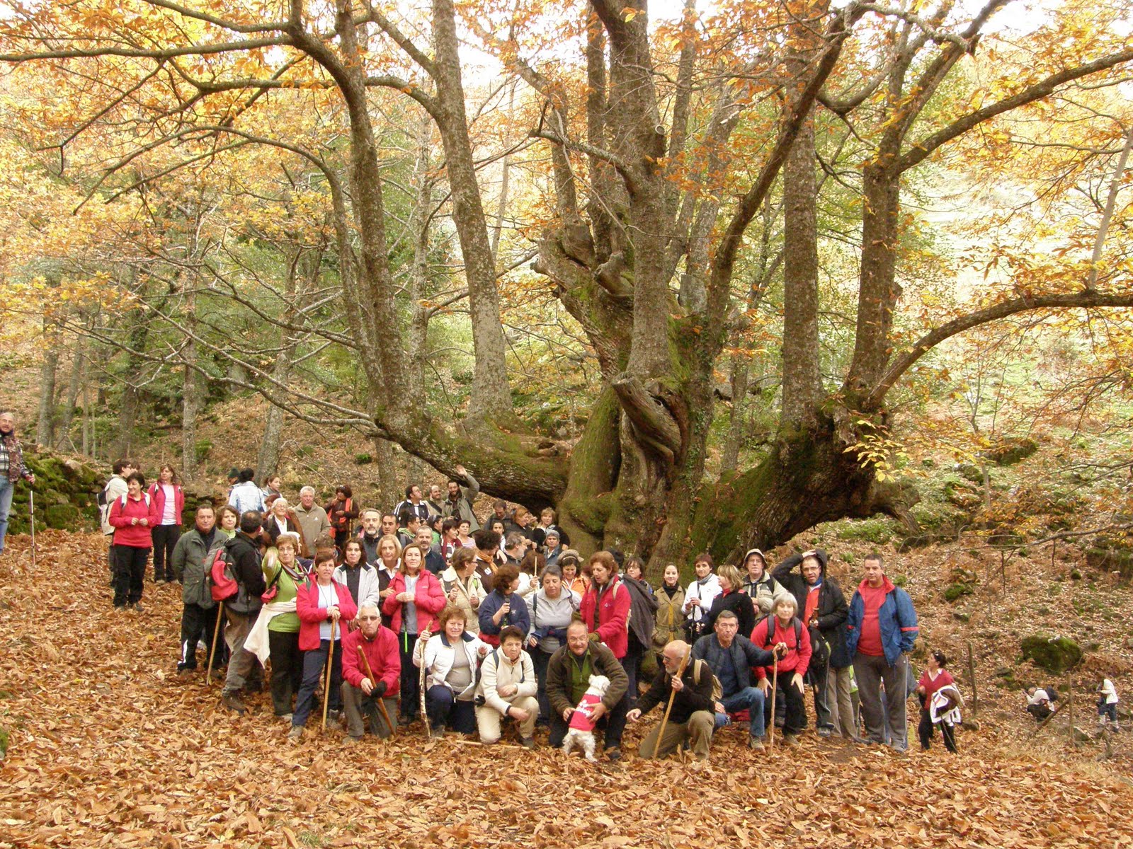 Vicente, sería el guía de la ruta que estuvo ayudado por algunos vecinos de la comarca que aportaron añadidos alternativos que la hicieron todavía mas atractiva. Al comienzo nos quiso explicar algunos detalles del camino y de sus pueblos; al fondo el Valle del Ambroz cuya imagen nos acompañaría durante toda la ruta. Nuestro primer destino: Los Castaños del Temblar, un conjunto de cinco árboles singulares de Extremadura.