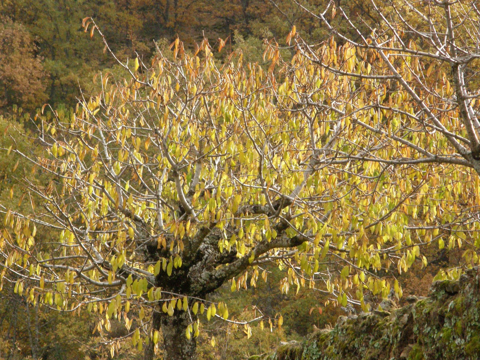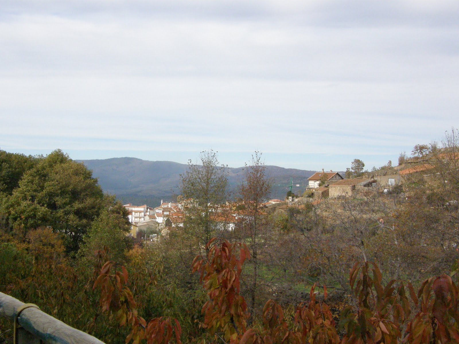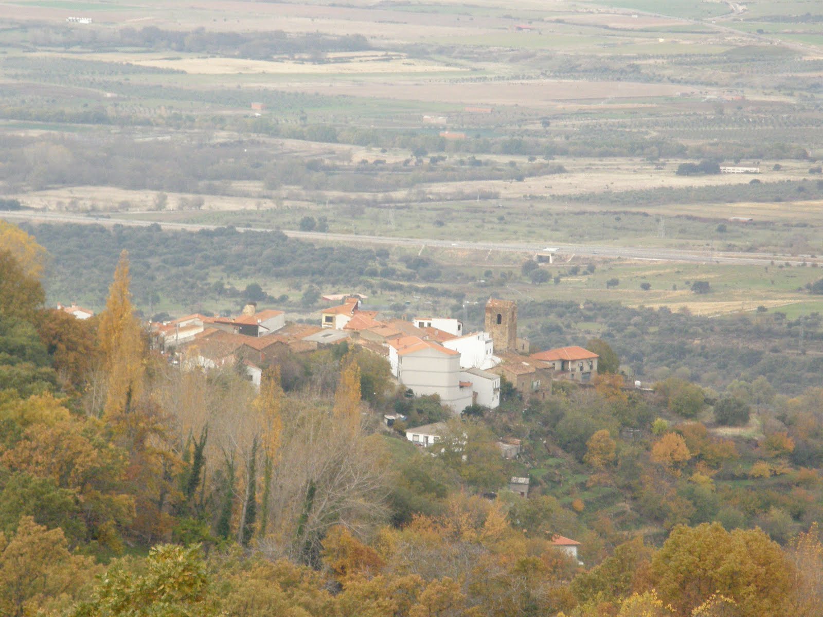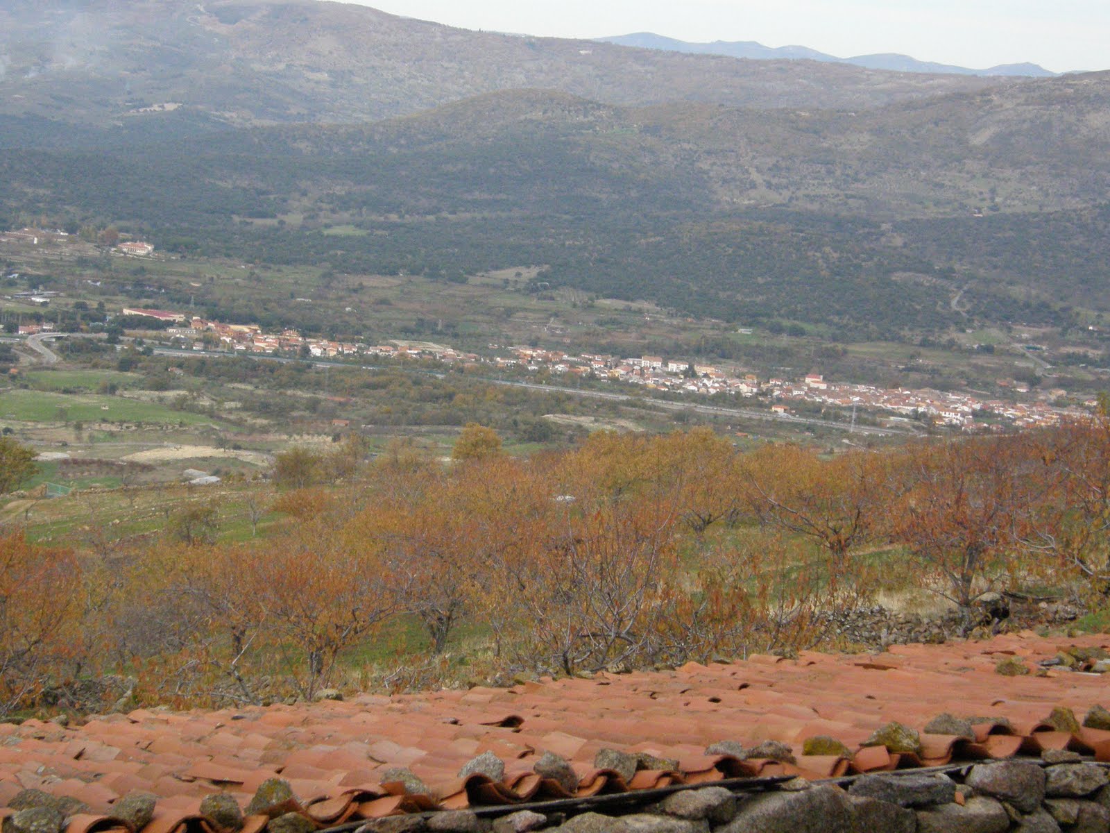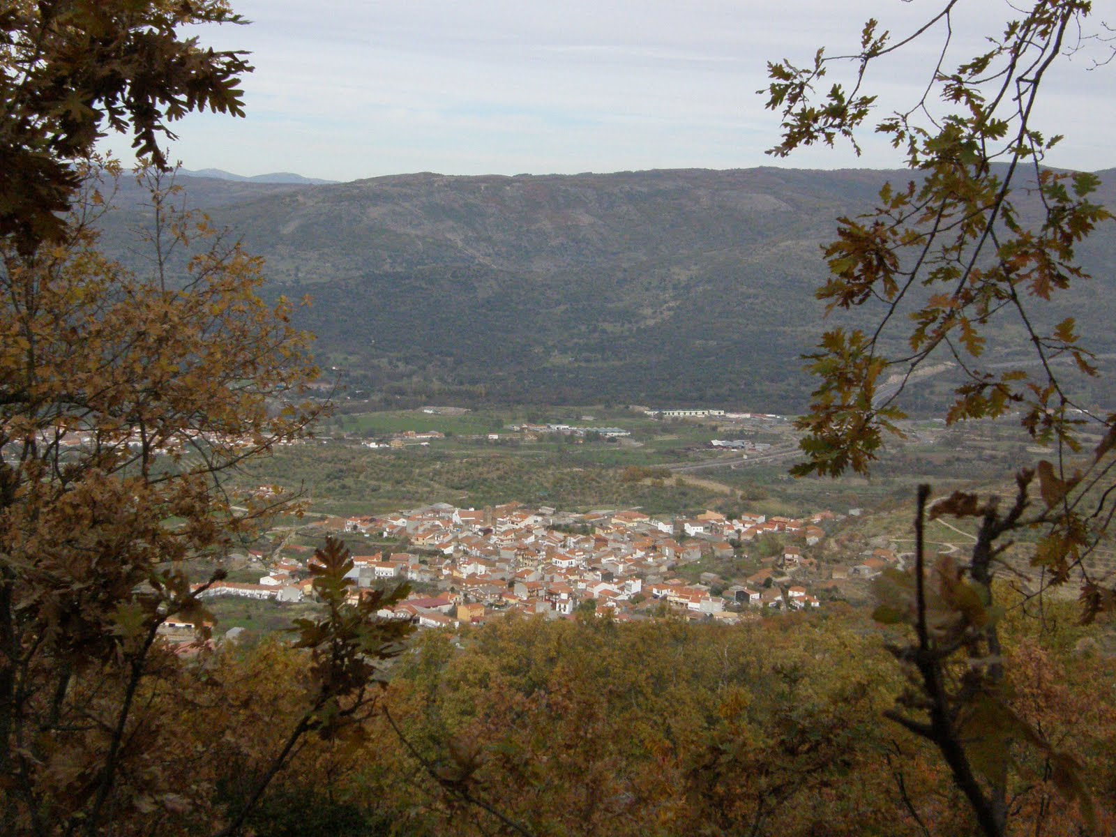 Aldeanueva del Camino, reposo del viajero, mientras fue posada de la N-630. Y, en primer término, cerezos en otoño que también abundan en el Valle. Justo detrás de nosotros está el Valle del Jerte.
