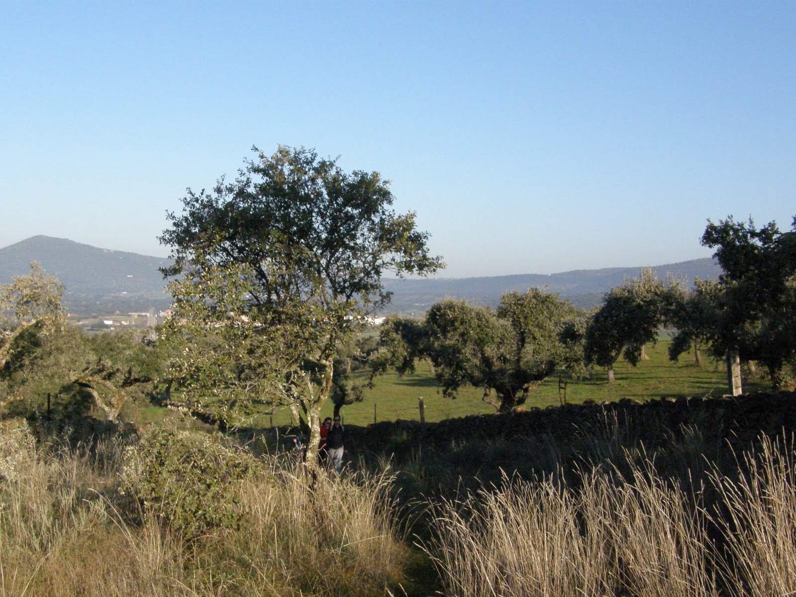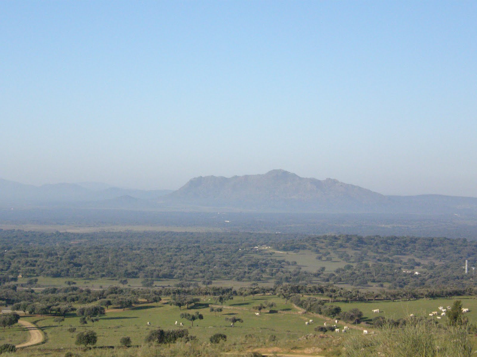Desde aquí ya podemos disfrutar de una amplia panorámica de toda la penillanura que se ofrece a nuestros pies con las sierras de Santa Cruz y Montanchez al fondo.