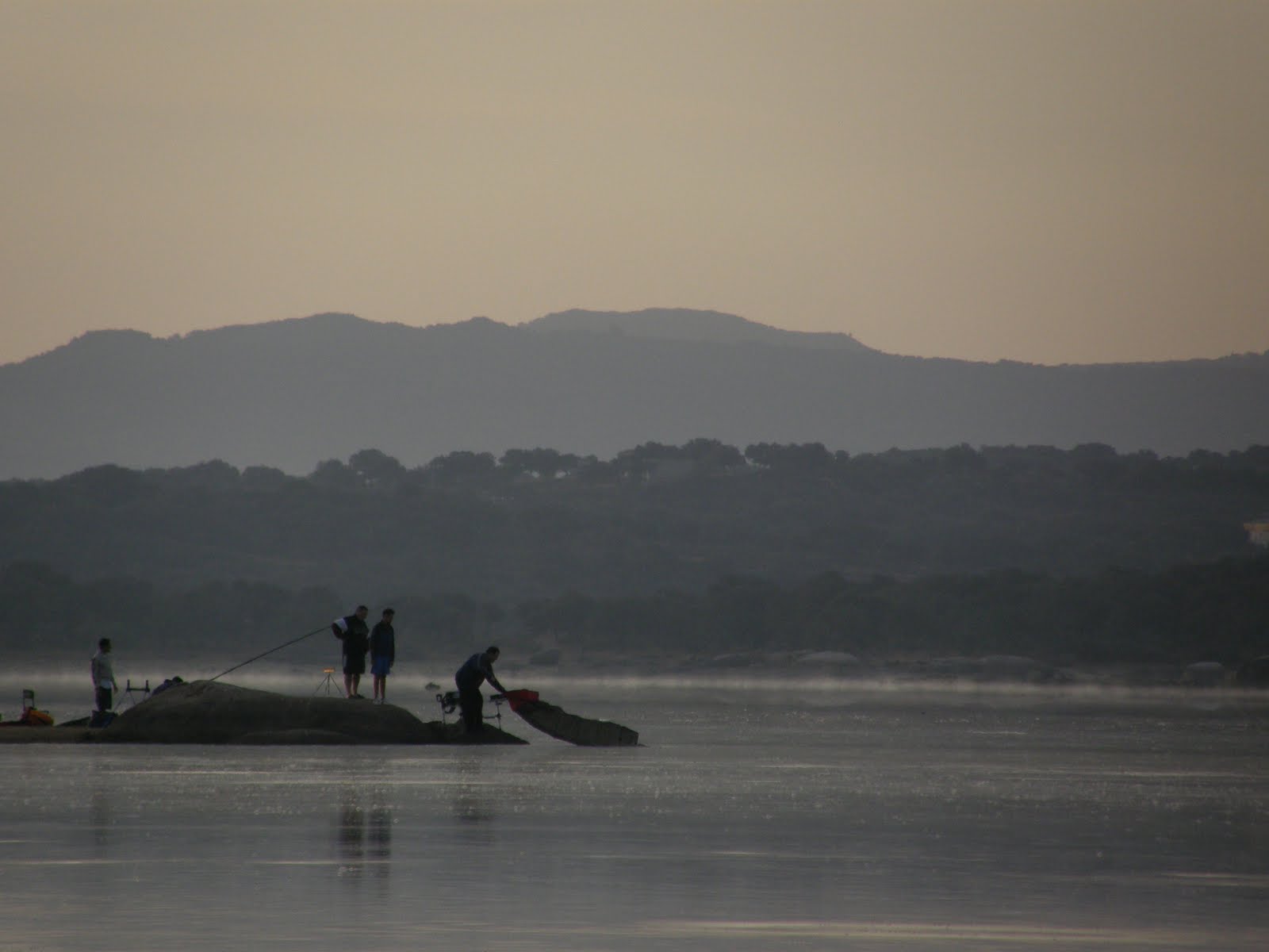 La luz descubre la actividad del pantano. Pacientes, los pescadores preparan los aperos