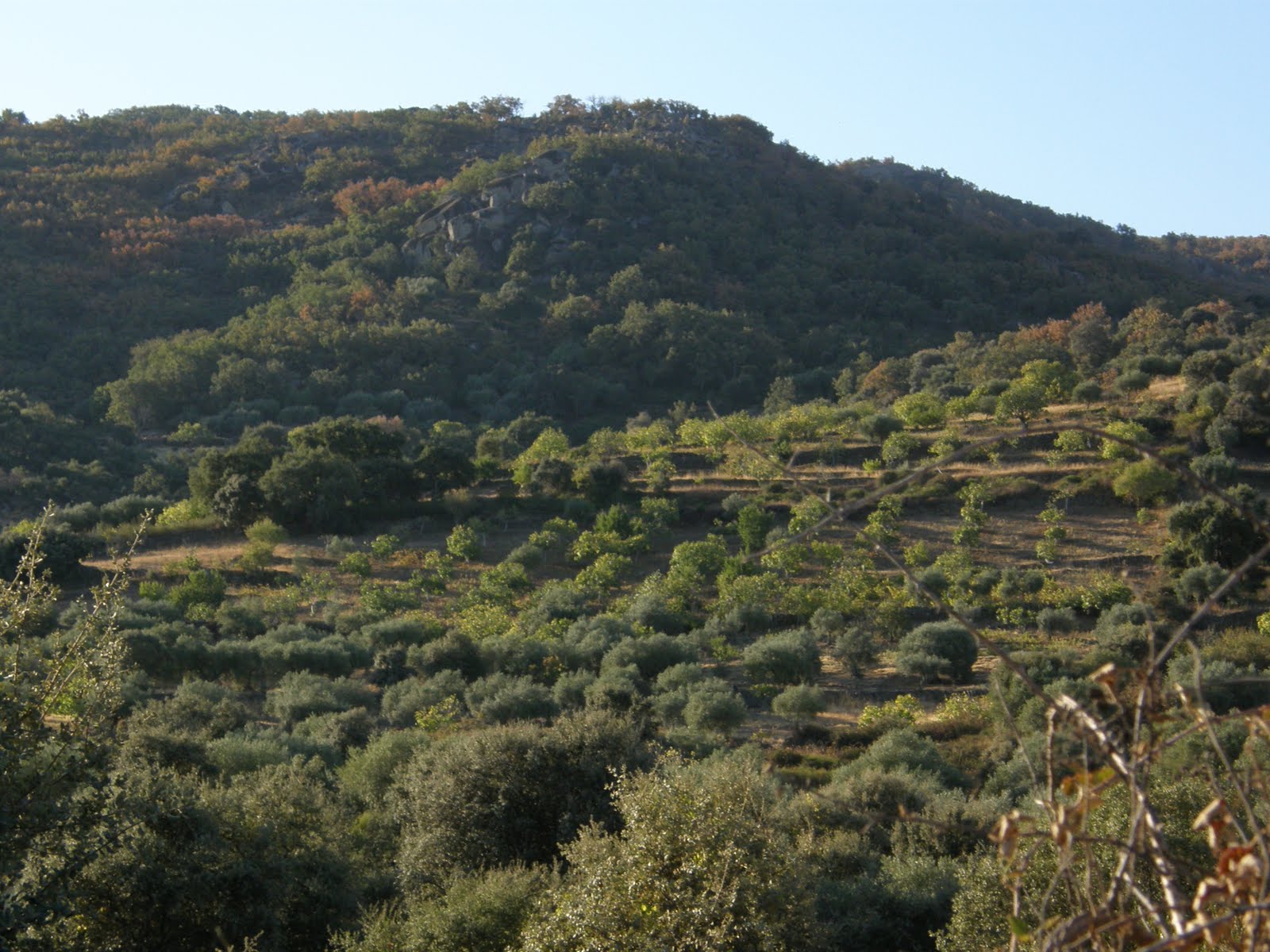 En un pequeño claro del bosque los bancales de cerezos del Jerte se asoman con su color de otoño.