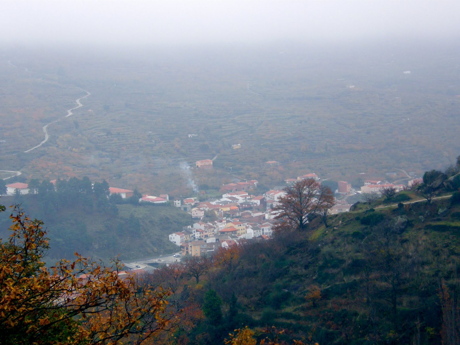 Abajo Navaconcejo, guardián de Las Nogaledas, se muestra entre la niebla.