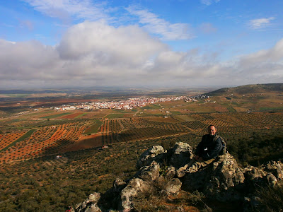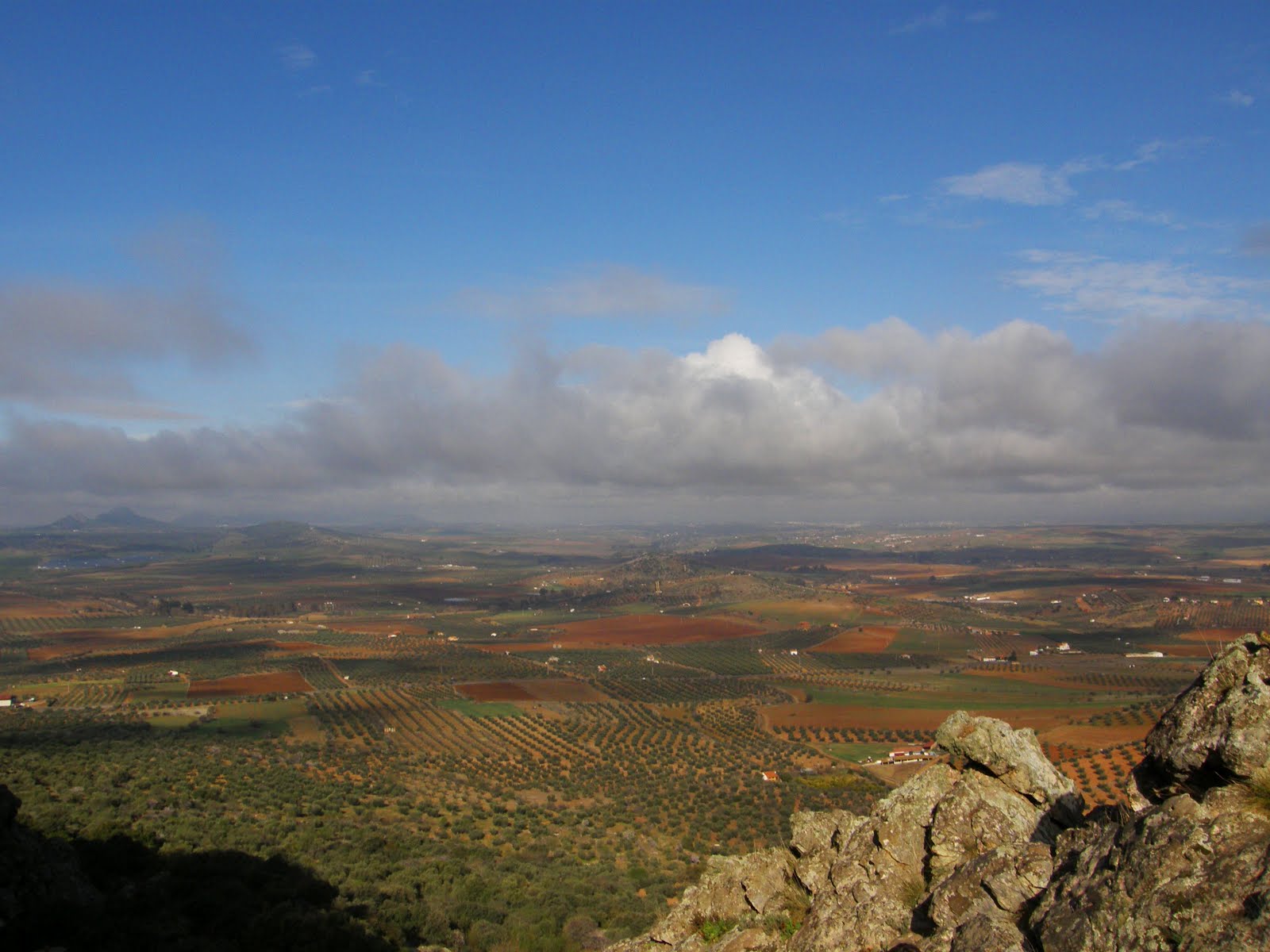 Al coronar la sierra, el día se abre y nos ofrece una postal de estas tierras de la Vega del Guadiana, en estos parajes, sobre todo, olivos y pastos. Julia, Alicia y Luisa, inmortalizadas arriba, al fondo La Zarza.