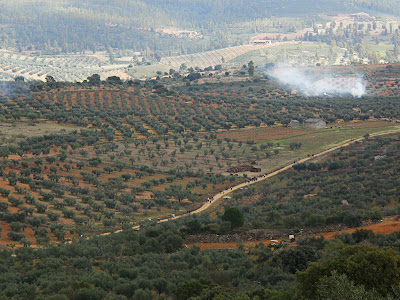 Desde abajo los olivos se presentan disciplinados, tierras limpias, ciudadas que miman el árbol