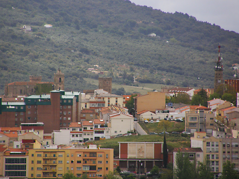 Arriba tenemos unas panorámicas de Cáceres poco habituales que cambian el perfil de la ciudad. La torre de la Plaza de Italia, la parte antigua y la sierra de la Mosca detrás.