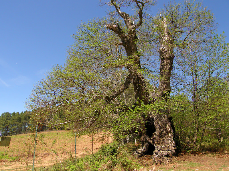 Así entre pinares, cerezos y robles se mantiene, vivo aunque no lo parezca, el Castaño del Abuelo, uno de los árboles singulares de Extremadura.
