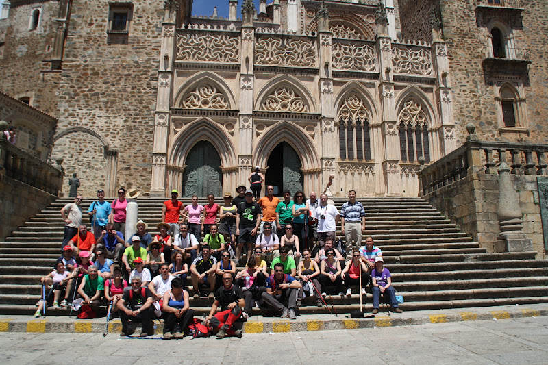 La ruta ha terminado, lo hacemos con una foto de familia en la Plaza de Santa María de Guadalupe en la escalinata del Monasterio. Quince kilómetros y medio después de salir de Cañamero hemos completado el trayecto.