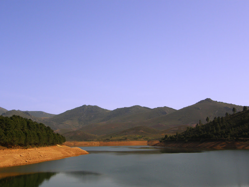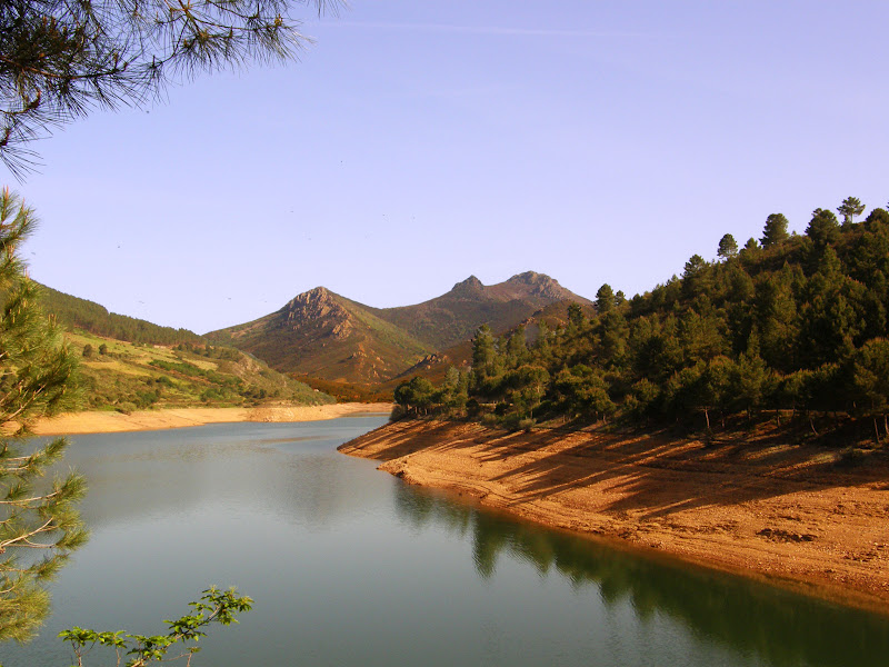 Al llegar al borde del embalse nos deleitamos con una panorámica de las Villuercas que nos acompañará durante buena parte de la ruta. Enfrente la Sierra de la Madrastra y la Sierra de Sancho