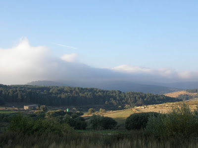 Nosotros suavizamos la subida y encaramos un falso llano mientras rodeamos la sierra por un bosque de pinos que en un día de viento como hoy es una orquesta de sonidos. Estilizados árboles que se mecen con el viento y parece que van a quebrarse.