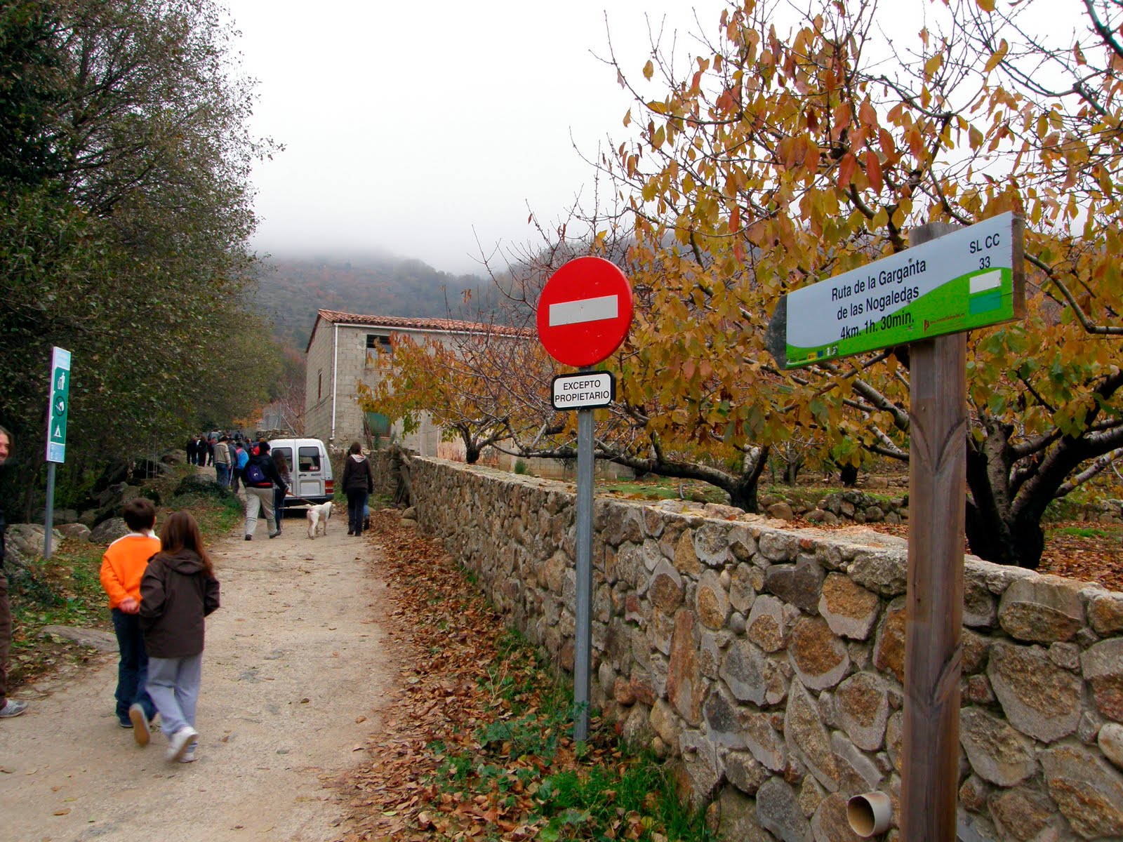 Salimos del pueblo por un camino que nos lleva entre pequeños huertos acotados por paredes de piedra en el paraje del Llano Herrero donde los castaños avisan de lo que vendrá después, un ejemplar centenario nos tiende la mano al borde del camino.