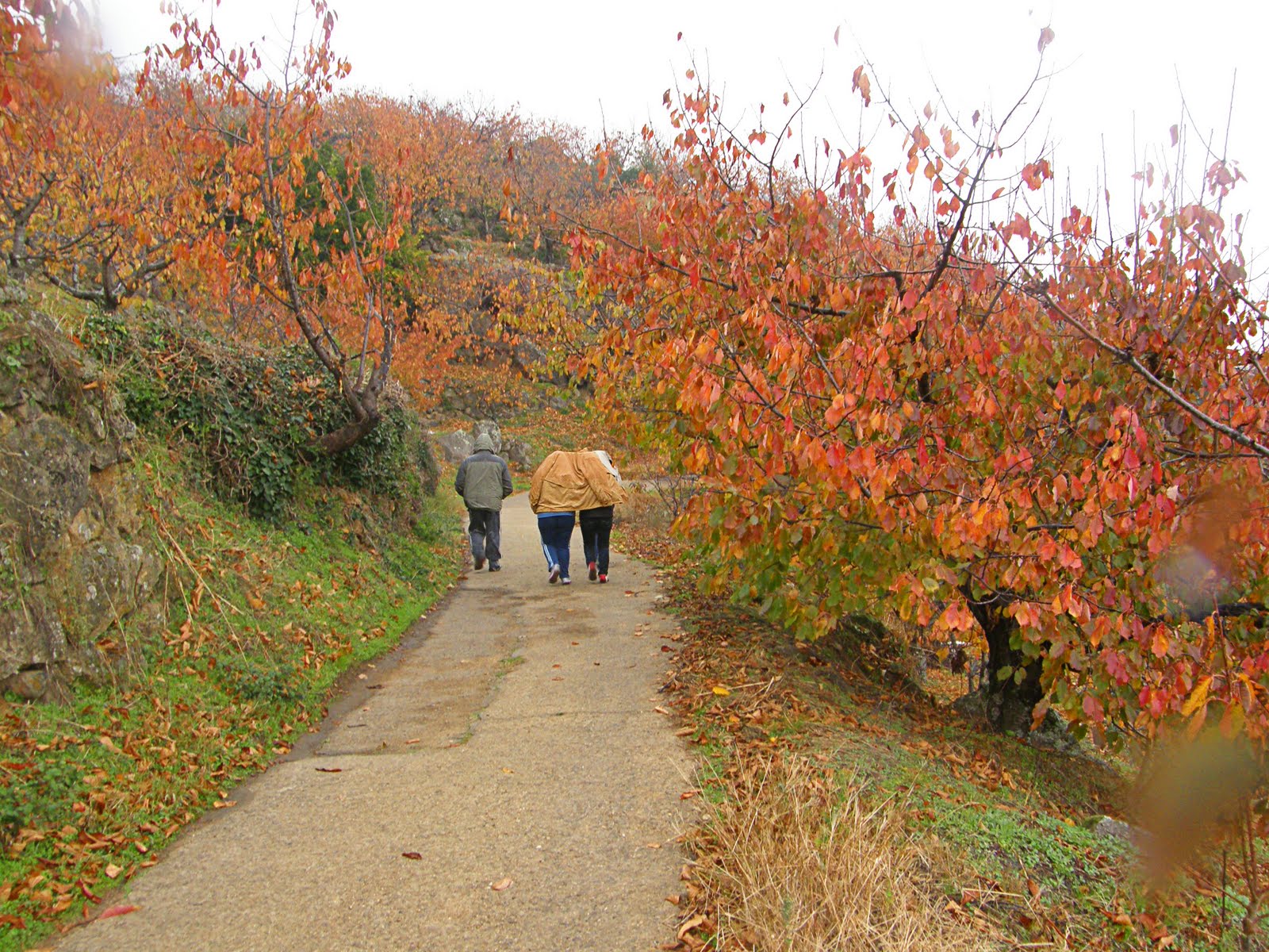 El camino de vuelta nos lleva entre bancales, donde la actividad es evidente, preparan los cerezos para el invierno. La tierra hay que cuidarla.